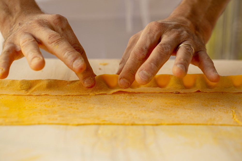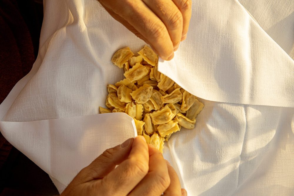 Il ripieno è molto semplice e normalmente viene usato il vitello e il maiale, con l’aggiunta di verdure. Talvolta qualcuno si lascia prendere dalla vena creativa e ti potrà capitare di assaporare ripieni con l’aggiunta di carni bianche, salumi o altri prodotti del territorio. Ciò che caratterizza gli agnolotti delle Langhe è sicuramente il loro aspetto: sono spesso molto piccoli, irregolari, realizzati con una sfoglia sottilissima e soprattutto sono chiusi con un pizzicotto, il plin, che in alcune zone chiamano anche “pessià”. Che sarà mai questo pizzico? In fondo è solo un modo per imprigionare il ripieno all’interno di una sfoglia. Ebbene, ha un suo valore intrinseco: il plin è suggello di garanzia perché questa piccola azione impressa sulla pasta stringendo l’agnolotto tra pollice, indice e medio può essere fatta solo ed esclusivamente usando le mani. Un gesto che conferisce una forma tipica, riconoscibile tra le tante, ma soprattutto che è conferma di una preparazione casalinga. Una pasta che può essere servita con sugo d’arrosto, ma viene esaltata al massimo da un semplice condimento a base di burro fuso e salvia. Nella tradizione venivano consumati “al tovagliolo”, ovvero cotti in brodo, colati e serviti su un tovagliolo di lino senza alcun condimento e da consumarsi rigorosamente con le mani.
