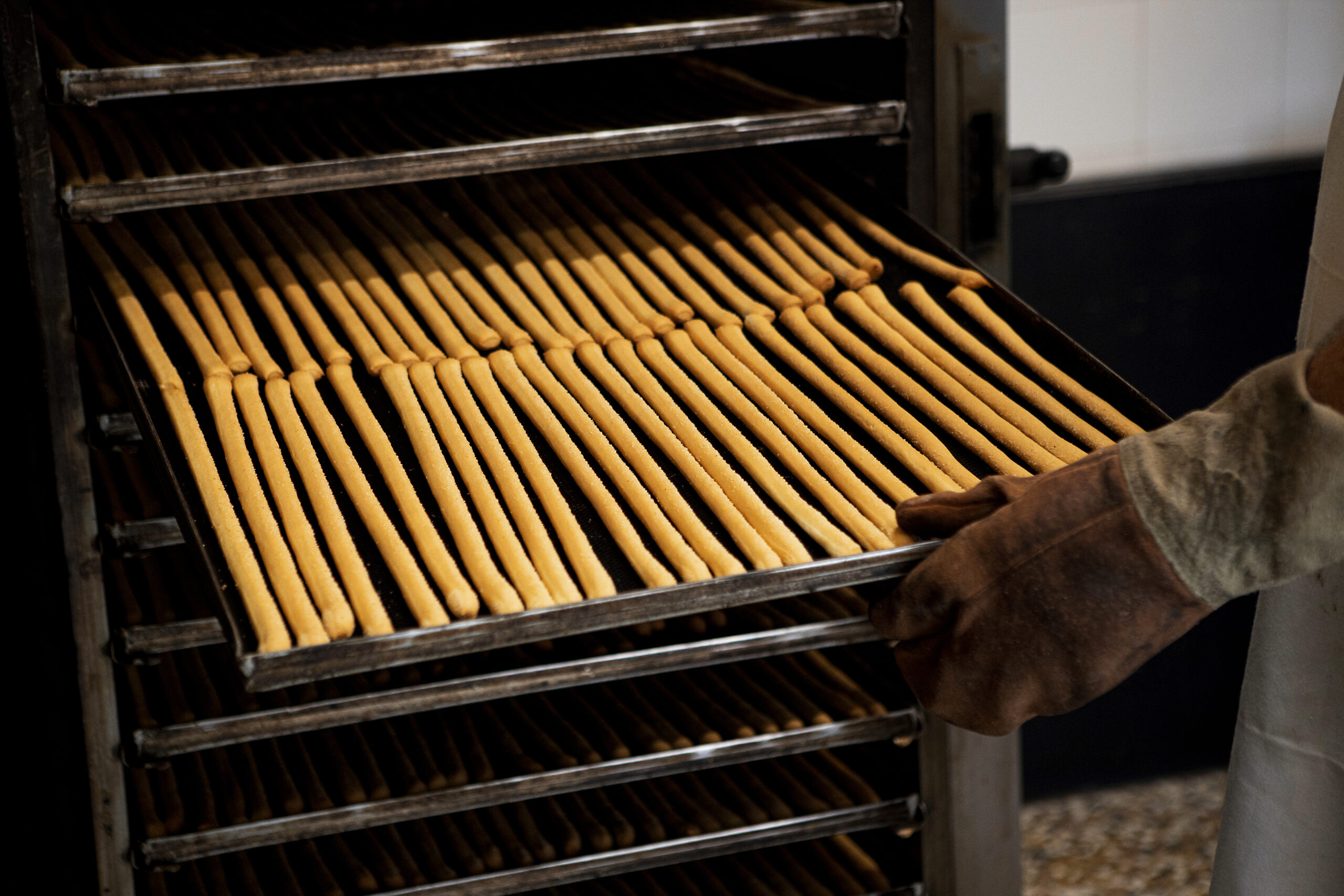 Il grissino è una storia tutta piemontese che inizia casualmente nel 1679. C’era un bimbo destinato a diventare Re, ma con una salute cagionevole e molte intolleranze e c’era un fornaio di corte, Antonio Brunero, che provò a trovare una soluzione: il grissino. Siamo a Torino nei palazzi dei Savoia e il piccolo che non poteva mangiare il pane tradizionale era Vittorio Amedeo II. Così quel bastoncino friabile, croccante e sfizioso è arrivato fino a noi. Ingredienti semplici (acqua, farina e olio extravergine di oliva), una ricetta e gesti che sono rimasti invariati nel tempo. Un colpo di genio divenuto tradizione e che vanta illustri storici estimatori. Pare che alcuni nobili sabaudi fossero soliti sgranocchiare grissini durante gli spettacoli al Teatro Regio di Torino e che Napoleone Bonaparte li amasse al punto da organizzare un trasporto da Torino a Parigi per gustare i “petits bâtons de Turin”, i bastoncini di Torino. Digeribili e facili da conservare raggiunsero un alto grado di notorietà e presto si diffusero in tutto il Piemonte e in altre regioni dove vennero declinati in varie forme e con nuovi ingredienti. Tuttavia la foggia tradizionale del grissino torinese è il robatà (rubatà, ovvero rotolato), riconoscibile dalle nodosità dovute alla lavorazione manuale. Nel Basso Piemonte si andò invece affermando il grissino stirato dove la pasta non viene arrotolata, ma allungata. Una manualità diversa che conferisce al grissino una maggiore friabilità.